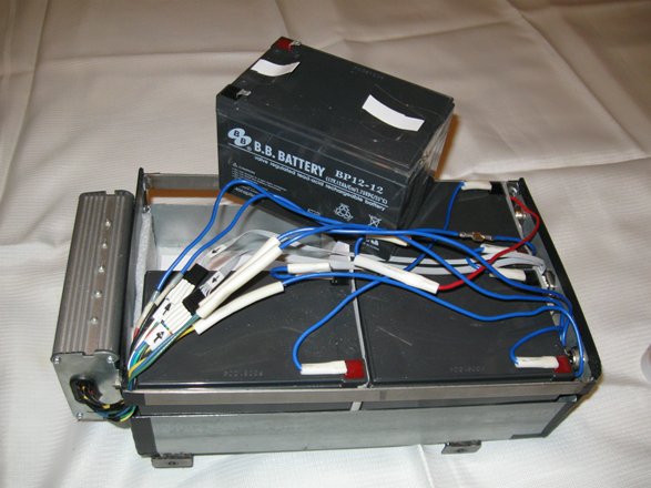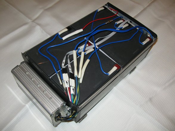 Для размещения 4-х аккумуляторов и крепления контроллера был изготовлен специальный ящик. В нем были установлены три разъема. Левый круглый 3-х контактный для подключения трех силовых проводов мотор-колеса. Центральный 15-ти контактный для подключения проводов тормоза, газа и моторных датчиков Холла. Правый круглый 2-х контактный для подключения зарядного устройства.